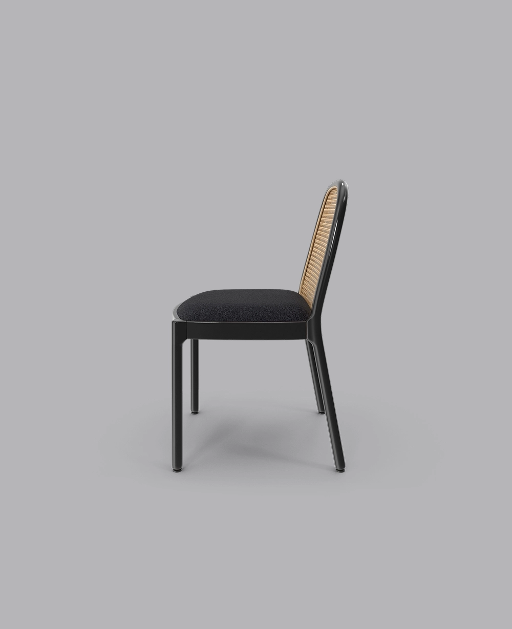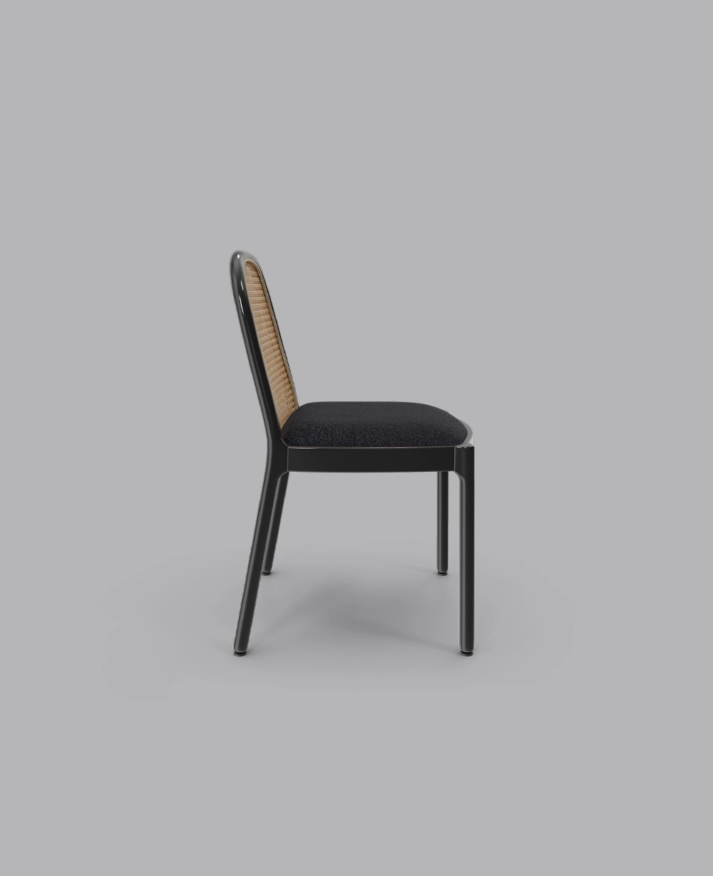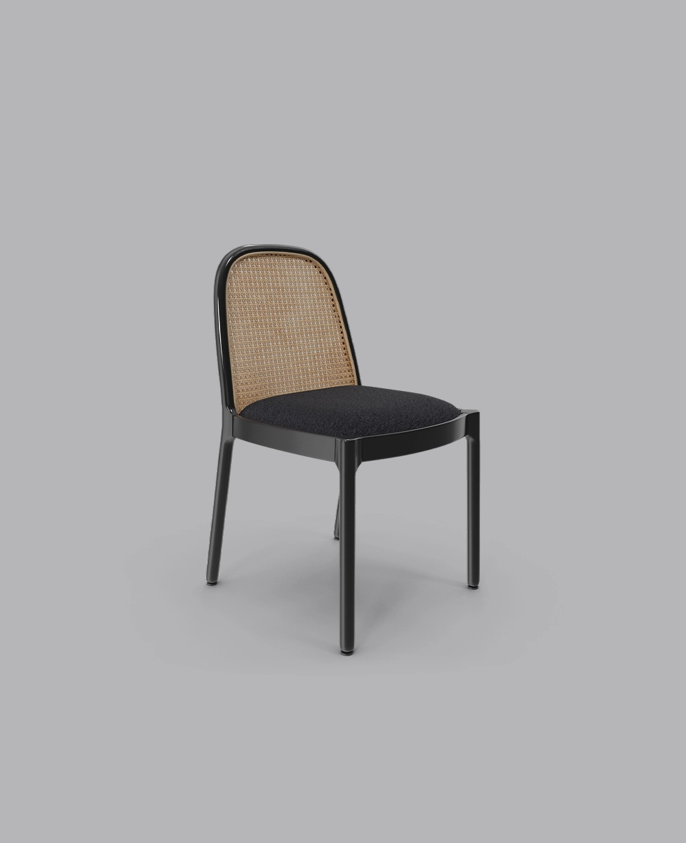 A modern chair with a woven cane backrest and padded seat, blending style and comfort for contemporary interiors.