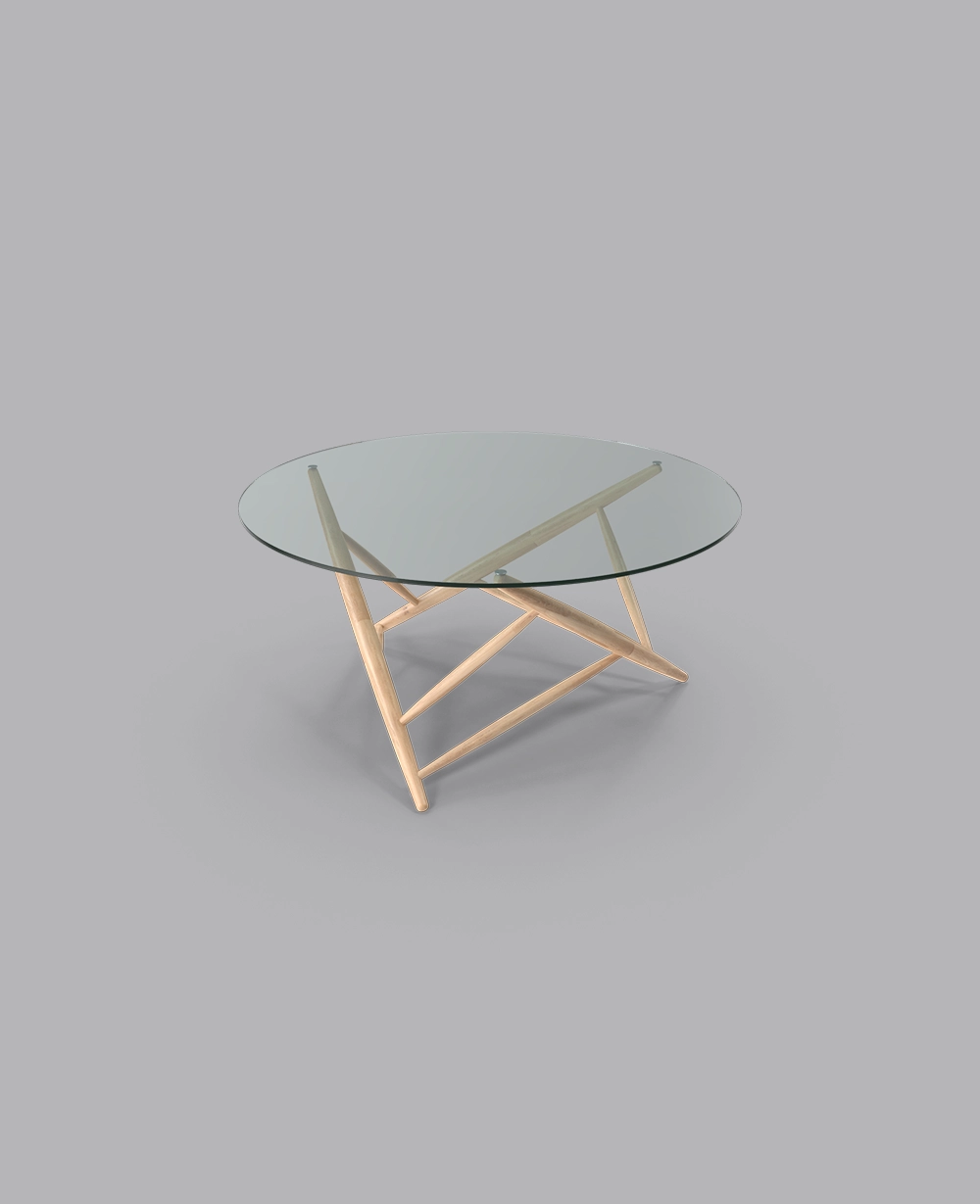 The Sky Table combines vibrant blue color with natural wood accents, offering a compact and stylish design with an open storage compartment for modern spaces.